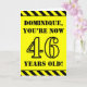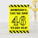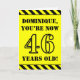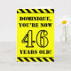 The front of this attention-grabbing and fun birthday-themed greeting card design features a customisable name and the message "YOU’RE NOW 46 YEARS OLD!" in black stencil style text on a yellow coloured background. The front also features an eye-catching black and yellow stripes pattern at the top and bottom edges. The inside features an editable birthday greeting message, or could perhaps be cleared and left blank if a message is to be written by hand instead. A customisable birthday card like this might be a fun way to send a message in celebration of somebody’s forty sixth birthday. [~Z0000413]