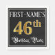 This ornate and fancy birthday themed paper napkin design features an editable name and the message “46th Birthday Party”. The large number “46th” has an imitation/faux gold-inspired coloring pattern, and the words “Birthday Party” are in elegant script-style text. The background is colored black by default (although it can be customized). Elegant, opulent paper napkins like this might be useful to have at a birthday party/celebration being held to honor somebody’s 46th birthday. [~Z0000565]