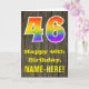 The front of this colourful yet rustic birthday-themed greeting card design features a large number "46" having a rainbow spectrum gradient inspired pattern. It also features the message "Happy 46th Birthday,", and a custom recipient name. The background of the front of the card features a rustic faux wood grain inspired pattern. The inside features a personalised birthday greeting message, or could perhaps be cleared and left blank if a message is to be written by hand instead. A customisable birthday card like this might be a fun way to send a message in celebration of somebody’s forty sixth birthday. [~Z0000419]