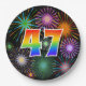 This cheerful, colourful, and fun paper plate design features a large number "47" having a rainbow spectrum gradient inspired pattern colouring. It also features a vibrant and exciting bursting celebratory fireworks inspired pattern. The background is coloured black. Fun paper plates like this might be used at a celebration being held to observe somebody’s forty seventh birthday, a forty seventh anniversary, or some other 47th event. [~Z0000490]