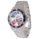 Has heft and feel of expensive stainless steel quartz watches. Good band with safety catch.  I removed links, which is easy because engraved arrows show direction to push the linking pins. As always by this seller, the image (a railroad logo) is a perfect reproduction of my emailed image, and is precisely spaced and aligned.