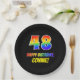 This cheerful, fun, and colourful birthday paper plate design features a large number "48" and the message "HAPPY BIRTHDAY,", both coloured with a rainbow spectrum gradient inspired pattern, along with a bold yellow editable name. It has a black coloured background. Fun, personalised birthday themed paper plates like this might be used at somebody’s 48th birthday celebration. [~Z0000488]