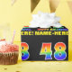 This colourful, fun, and cheerful birthday themed wrapping paper design features a large number "48" and the message "HAPPY BIRTHDAY,", both having a rainbow spectrum gradient inspired pattern colouring, along with a bold yellow customisable recipient name. The background is coloured black. Fun birthday themed wrapping paper like this might be used to wrap a gift or present being given to somebody who is celebrating their 48th birthday. [~Z0000475]