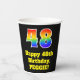 This fun and colourful birthday paper cup design features a large number “48” having a rainbow spectrum gradient inspired pattern. It also features the message “Happy 48th Birthday,”, and a customisable name. It also has a black-coloured background. Vibrant, colourful paper cups like this might be fun to use at a birthday celebration being held to celebrate somebody’s 48th birthday. [~Z0000537]