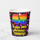 This happy and fun birthday-themed paper cup design features a large number “48” having a rainbow spectrum gradient inspired pattern. It also features the message “Happy 48th Birthday,”, and a custom name. The background features a pattern of purple, red, and pink heart shapes of various sizes. Cheerful, happy paper cups like this might be fun to have at a birthday celebration/party being held to honor somebody’s forty eighth birthday. [~Z0000548]