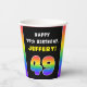 This joyful and cheerful birthday themed paper cup design features a large number “49“ having a vibrant multicolored rainbow spectrum inspired gradient pattern, along with the message “HAPPY 49th BIRTHDAY,”, and a personalised recipient name. Upbeat paper cups like this might be fun to use at a birthday party in honour of somebody’s forty ninth birthday. [~Z0000639]