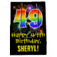 This fun, colourful, and exciting birthday themed gift bag design features a large number "49" with a rainbow spectrum gradient inspired pattern, along with the message "Happy 49th Birthday,", and a custom recipient name. It also has a colourful bursting celebratory fireworks inspired background pattern. A gift bag like this might be used when wrapping gifts being given to somebody in celebration of their 49th birthday. [~Z0000509]