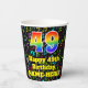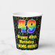 This cheerful and joyful music-themed birthday paper cup design features a large number “49” having a rainbow spectrum gradient inspired pattern. It also features the message “Happy 49th Birthday,”, and a customisable name. The background features a colourful pattern of various music notes and symbols having a variety of sizes and colours. Colourful, vibrant paper cups like this might be fun to use at a birthday party/celebration being held to honour somebody’s forty ninth birthday. [~Z0000541]