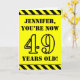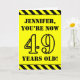 The front of this fun and attention-grabbing birthday themed greeting card design features an editable name and the message "YOU’RE NOW 49 YEARS OLD!" in black stencil inspired text on a yellow colored background. The front also features an eye-catching black and yellow striped pattern at the top and bottom edges. The inside features a personalized birthday greeting message, or could perhaps be cleared and left blank if a message is to be written by hand instead. A birthday card like this might be a fun way to send birthday wishes to somebody who is celebrating their forty ninth birthday. [~Z0000413]