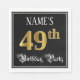 This elegant and opulent birthday-themed paper napkin design features a custom name and the message “49th Birthday Party”. The large number “49th” has a faux/imitation gold-inspired coloring pattern, and the words “Birthday Party” are in ornate script-style text. The background is colored black by default (although it can be customized). Fancy, luxurious paper napkins like this might be used at a birthday celebration/party being held to celebrate somebody’s forty ninth birthday. [~Z0000565]
