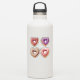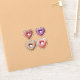 Four heart-shaped doughnuts with red, white, purple, and pink frosting topped with sprinkles. They're yummy-looking and fun!