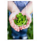A little girl hands holding a handful of four-leaf clovers for St. Patrick's Day.