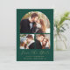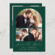 This simple, minimalist Save the Date card features a 3-photo collage arch above the words "Save the Date" in elegant gold-coloured handwriting script, followed by the couple's names, wedding date and city in sans serif font on an emerald green background. Add a fourth, horizontal photo and a more detailed message with additional information on the back.