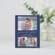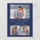 This simple, minimalist Save the Date postcard features a horizontal photo at the top and two smaller square photos at the bottom. In between, the words "Save the Date" appear in elegant white handwriting script, followed by the couple's names, wedding date and city in sans serif font on a navy blue background. Add a fourth, horizontal photo to the back, along with your return address and additional details.