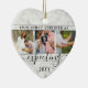 Celebrate the precious gift of your newest family member with a stylish four photo collage heart-shaped ceramic ornament. Gender neutral design with faux marble border is suitable for a new baby boy or girl. Wording and pictures on this template are simple to personalize. (IMAGE PLACEMENT TIP: An easy way to center a photo exactly how you want is to crop it before uploading to the Zazzle website.) Ideas for pictures could be an ultrasound, sonogram, new parents or mother to be maternity photos, or images of baby shoes or onesy. Name, year, due date, and "Our First Christmas Expecting" quote is easy to change in case it's needed for another occasion. Design features a white faux marble border, stylish handwritten script calligraphy, modern minimalist typewriter style typography, and four photos of your choice. This unique pregnancy announcement keepsake adds an elegant touch to the expecting parents' or grandparents' Xmas home decorations.