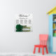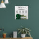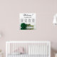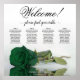 This stunning wedding seating chart has four tables with 10 seats per table, accommodating a total of 40 guests. The chart is adorned with a sophisticated and romantic design, featuring a single long-stemmed rose in a rich deep emerald green colour, delicately resting on its side and casting a reflection in a serene pool of water. The chart's title, written in graceful script calligraphy, warmly welcomes guests with "Welcome! Please find your table" while leaving ample space below for the names of the couple and wedding date. This elegant seating chart serves as a charming and practical way to greet and assist your guests in finding their designated seats at your wedding reception.