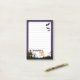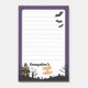 This spooky personalised post-it features a playful Halloween theme with a deep purple border framing a white writing area, lined for easy note-taking. The top right corner is haunted by three black flying bats, while the bottom is adorned with a spooky silhouette of a haunted house with glowing orange windows, leafless trees, and crooked graveyard crosses. At the centre of the base, the phrase "Trick or Treat" pops in a fun, bold orange font. Fully customisable, this post-it allows you to change the name, making it the perfect seasonal stationery for Halloween parties, themed notes, or festive reminders.