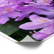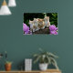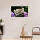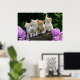 4 adorable yellow kittens sitting on a log surrounded by purple flowers.