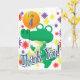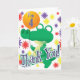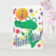 Cute green alligator holding an orange balloon with text I'm 4 on this 4th Birthday design on coordinating Fourth Birthday t-shirts, buttons, party invitations, thank you notes and postage.