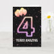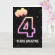 Party balloons and confetti on black background with the neon number 4 for a 4th birthday.
