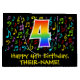 This fun, colourful, and vibrant birthday gift-bag design features a large number "4" having a rainbow spectrum gradient inspired pattern. It also features the message "Happy 4th Birthday,", and an editable name. Part of the background features a pattern of various music notes and symbols having a variety of colours and sizes. A birthday themed gift bag like this might be a fun way to wrap a gift or present being given to somebody who is celebrating their 4th birthday. [~Z0000425]