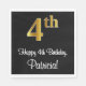 This luxurious, sophisticated, and stylish birthday themed paper napkin design features a large ordinal number “4th” having a faux/imitation gold-inspired appearance, along with the birthday greeting message “Happy 4th Birthday,” and a custom name in a script-style font. It also has a black-coloured background. Paper napkins like this might be used at a birthday party held in celebration of somebody’s fourth birthday. [~Z0000516]