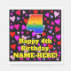 This cheerful and fun birthday themed paper napkin design features a large number “4” with a rainbow spectrum gradient inspired pattern, along with the message “Happy 4th Birthday,”, and an editable name. The background features a pattern of heart shapes with colours like red, pink, and purple. Fun, joyful paper napkins like this might be fun to have at a birthday party/celebration being held to celebrate somebody’s 4th birthday. [~Z0000550]