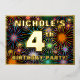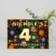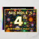 The front of this joyful and bold fourth birthday party foil invitation card design features a custom name, a large number “4th”, the message “BIRTHDAY PARTY!”, and a border. The background of the front has a vibrant, colourful pattern that resembles bursting celebratory fireworks. The back features personalised details about the event, such as the date, time, place, and any other information that may be useful. Customised invitations like these might be a fun way to invite guests/attendees to a birthday party/gathering being held to celebrate somebody’s 4th birthday. [~Z0000602]