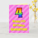 The front of this cheerful and festive 4th birthday themed greeting card design features a large number "4" having a colourful rainbow spectrum inspired gradient pattern. It also features the message "Happy 4th Birthday,", and a customisable recipient name. The background of the front features a dark pink and light pink stripes pattern containing loving pink heart shapes. The inside features an editable birthday greeting message, or could perhaps be cleared and left blank if a message is to be written by hand instead. A customisable birthday card like this might be a fun way to acknowledge somebody’s fourth birthday. [~Z0000416]