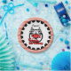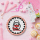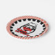 A red racing car, black steering wheel, chequered flags, text that reads 4th Birthday, and a border of red and white stripes on car racing theme birthday paper plates that you can personalise with a name before ordering!