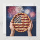 Two hands proudly lifting a cherry pie adorned with a beautiful American flag crust design, set against a dazzling backdrop of fireworks.