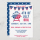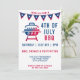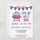A simple and modern invitation for a 4th of July BBQ. With bunting and an ombré bbq grill graphic. A patriotic design in red white and blue. Perfect for an Independence Day backyard barbecue cookout celebration.