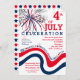 Patriotic BBQ and Fireworks Independence Day Celebration invitation. Features fireworks bursts and a waving flag on front and a red and blue stars pattern on back. Personalise with your party details. Original design by Holiday Hearts Designs (all rights reserved). If you require design assistance, please email us at info@holidayheartsdesigns.com.