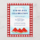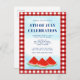 It is decorated with watercolor watermelons and a blue sky on a red and white buffalo check background.