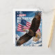 4th of July Happy Independence Day Greeting Postcard. A majestic bald eagle soaring with the American flag in the background symbolises freedom and strength. The greetings at the back, as desired.