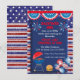 This simple, patriotic 4th of July Independence Day Party invitation. The invitation design is for a 4th of July Backyard BBQ event. The background features patriotic red, white, and blue colours with star and stripe patterns. Decorative elements include festive fireworks graphics and themed banners at the top. The invitation text is centred and highlights the event details in bold, red and white fonts.
