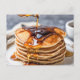 Tall stack of pancakes with dripping syrup and a pat of butter for a 4th of July pancake breakfast.