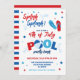 A fun 4th of July Pool Party Invitation in a red and blue colour scheme with a striped design at the back. Perfect for a patriotic Summer celebration!