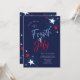 4th of July Red White Blue Fireworks Party Invitation features red, white and blue stars, along with firework details and modern calligraphy.