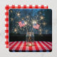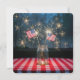 Sparklers radiate brightly from a jar adorned with small American flags, set on a red and white chequered tablecloth.