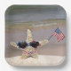 Starfish with flag sunglasses and bikini in beach sand holding an American flag for 4th of July Party