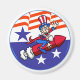 Show your patriotism with this 4th of July design with Uncle Sam riding on a rocket with a red, white and blue background.