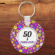 "50 and Fabulous" 50th Birthday keychain. The purple and black text colours can be changed to fit your preference. The cute underlying floral pattern will make the recipient smile every time she looks at it!