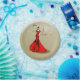Eye-catching hand drawn fashion illustration of an elegant lady in an elegant red evening gown. Golden background with sparkling glitter. The words "50" and "fabulous" are written in glamourous gold, the letter "&" is written in the same intense red as the dress.