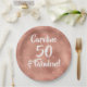 Paper party plates that celebrate milestone birthdays with a flair. "50 (name/age/year can be customised) and fabulous" in modern brush stroke white text on copper and hearts background.