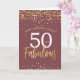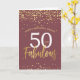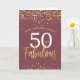Modern 50 and fabulous birthday card. This stylish design features typography script in gold and white on a dark rose gold background and gold confetti. Personalise with a name on the front and your message inside.