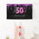 A trendy and glamourous 50 & Fabulous birthday party banner. A classic black background decorated with dark purple faux glitter drips, paint dripping look. With the text: 50 Fabulous. Personalise and add a name and a date. Date of birth or the date of the party. The name is written with a modern hand lettered style script. Light lavender coloured text. Age: 50 with a trendy balloon style font. Perfect both as a welcome banner or as party decor.