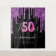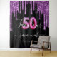 A trendy and glamourous 50 & Fabulous birthday party tapestry. A classic black background decorated with dark purple faux glitter drips, paint dripping look. With the text: 50 Fabulous. Personalise and add a name and a date. Date of birth or the date of the party. The name is written with a modern hand lettered style script. White coloured text. Age: 50 with a trendy balloon style font.