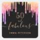 A trendy and glamourous 50th birthday sticker. A classic black background decorated with rainbow coloured faux glitter drips, paint dripping look in purple, pink and rose gold. With the text: 50 and fabulous. Personalise and add a name. Golden coloured text. The word Fabulous is written with a modern hand lettered style script with swashes.