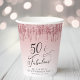 Elegant and chic personalised 50th birthday party paper cups featuring "50 & Fabulous" written in a stylish script against a pink ombre background, with pink and rose gold faux glitter dripping from the top. Personalise with her name and date of the party.